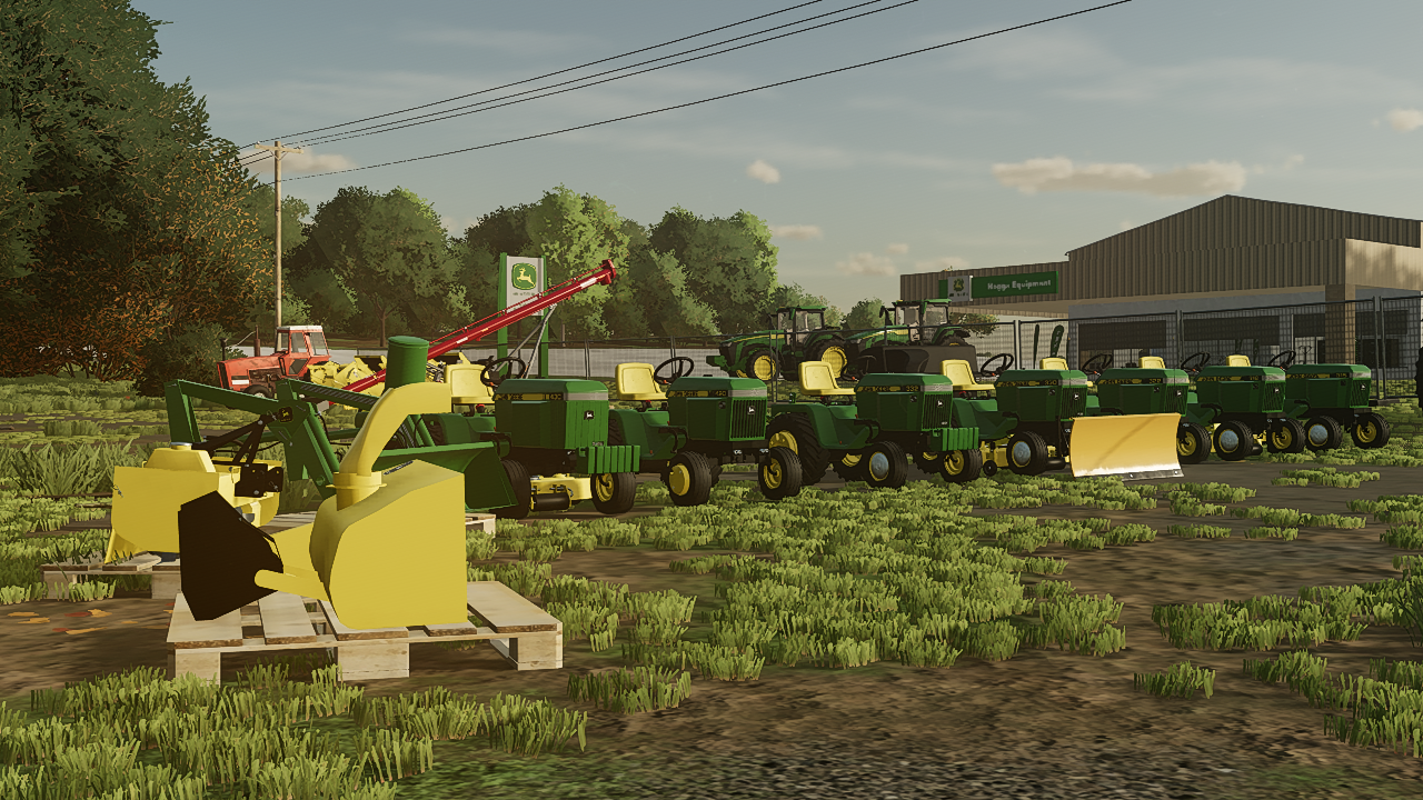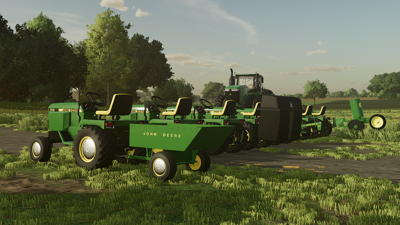 Features 3 tractors. The 300 series (316, 318, 322, 330, and 332) plus the 420 and 430. 2 attachments. A cutting deck and a mini tow behind trailer (made by Sleutjes modding just edited to be better quality) Additionally has attaching wheel weights, a attaching suitcase weight bracket, and a attaching suitcase weight. Allowing you to stack up to 7 weights on the bracket. Plus 2 on the wheel weights.